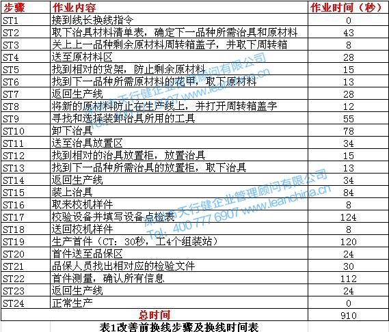根據(jù)現(xiàn)場(chǎng)觀察,該組裝車間對(duì)物料和治具管理均采用集中放置管理的方法,現(xiàn)行的換線作業(yè)過(guò)程都是由操作員在組裝線停線后進(jìn)行換線。詳細(xì)換線步驟和換線時(shí)間記錄如表1所示:
